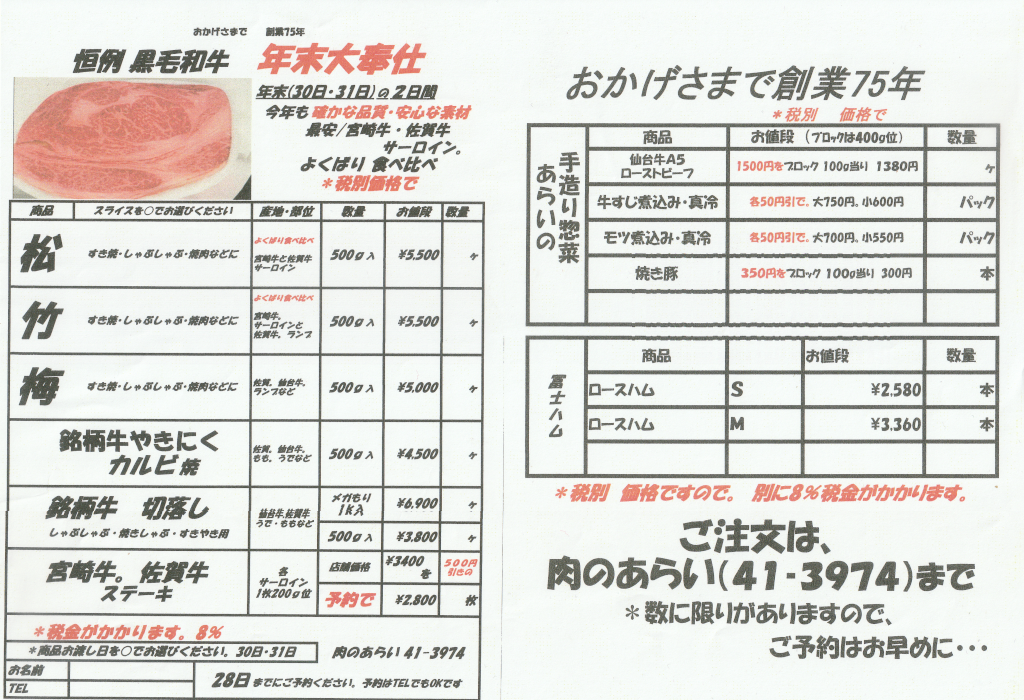栃木県足利市の肉屋店肉のあらい。牛は黒毛和牛のメスや豚の精肉の通信販売・揚げ物などの加工食品を販売しています。